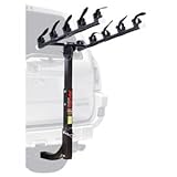 The Allen rack boasts a patented tie-down system and individually cradles up to five bikes in the 28-inch carry arms. A separate tie down strap is included with the rack and eliminates lower bike movement completely. As easy to install as it is to use, the rack sets up in less than 5 minutes with a no-wobble bolt that holds it still within the hitch. When the rack is not in use, the carry arms quickly drop out of the way and fold down flat with a patented single pin mechanism and the rack tilts up to allow easy access to the lift gate.